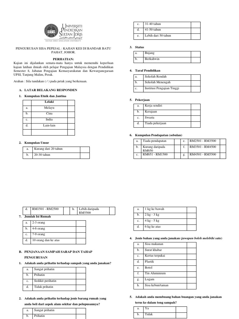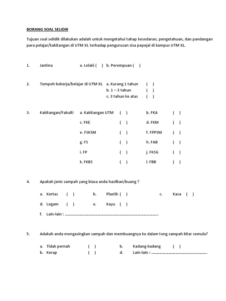 Related : Borang Soal Selidik Sisa Domestik - Borang soal selidik makluman respondan soal selidik ini adalah bagi memenuhi keperluan kajian untuk mata pelajaran hubungan etnik mpu 3113..
