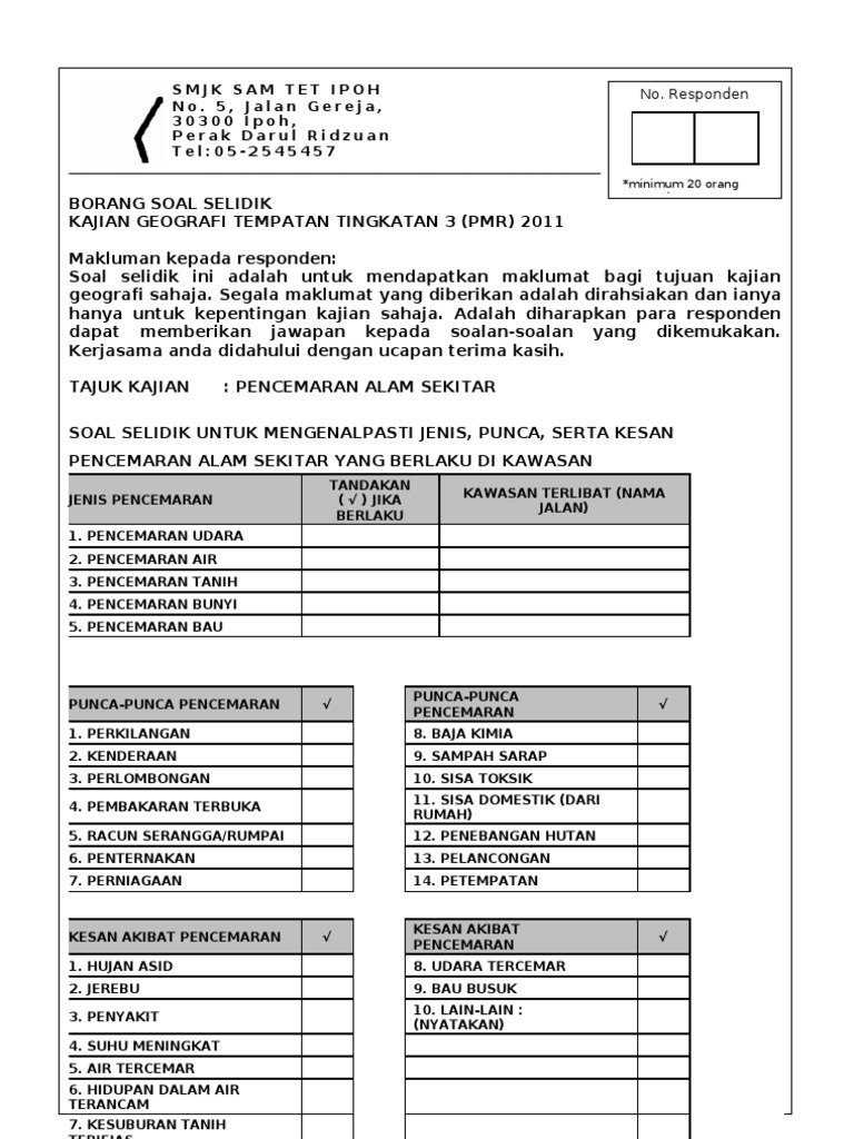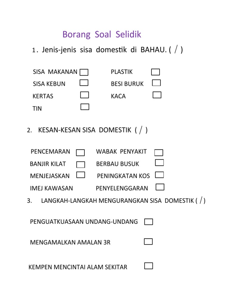 Contoh soalan soal selidik pencemaran udara selangor c trainees2013 contoh soalan borang soal selidik geografi borang soal selidik geografi sisa domestik guru paud. Borang soal selidik docx smk kelana jaya borang soal selidik kerja lapangan geografi tingkatan 1 tahun 2019 tandakan pada ruang yang berkenaan course hero. Pembuangan sisa jualan/makanan di prem pemungutan dan pengendalian sisa domestik tidak mengikut jadual amalan/ tabiat pembuangan sisa domestik penduduk tempatan sisa pepejal daripada kilang. Add to collection(s) add to saved. Borang soal selidik makluman respondan soal selidik ini adalah bagi memenuhi keperluan kajian untuk mata pelajaran hubungan etnik mpu 3113.
