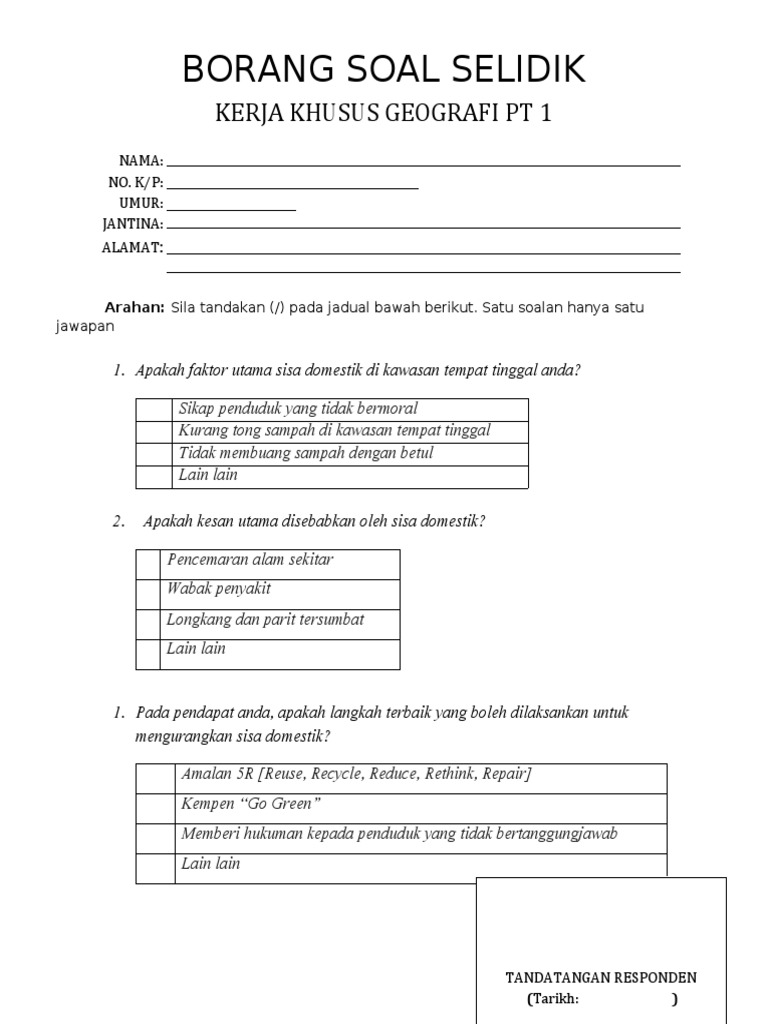 Borang Soal Selidik Geografi Sisa Domestik Guru Paud from online.fliphtml5.com So please help us by uploading 1 new document or like us to download Please fill this form, we will try to respond as soon as possible. Apakah faktor atau punca pembuangan sisa domestik di kawasan kajian. Contoh soalan soal selidik pencemaran udara selangor c trainees2013 contoh soalan borang soal selidik geografi borang soal selidik geografi sisa domestik guru paud. Koperatif dalam pembelajaran dan pengajaran sains d. Borang soal selidik docx smk kelana jaya borang soal selidik kerja lapangan geografi tingkatan 1 tahun 2019 tandakan pada ruang yang berkenaan course hero. Soal selidik ini dibentuk untuk mendapatkan maklumb. Tajuk kajian 'guna tanah di kawasan kajian anda' telah dipilih sebagai tugasan yang wajib disiapkan oleh setiap calon pt3 pada tahun 2018.