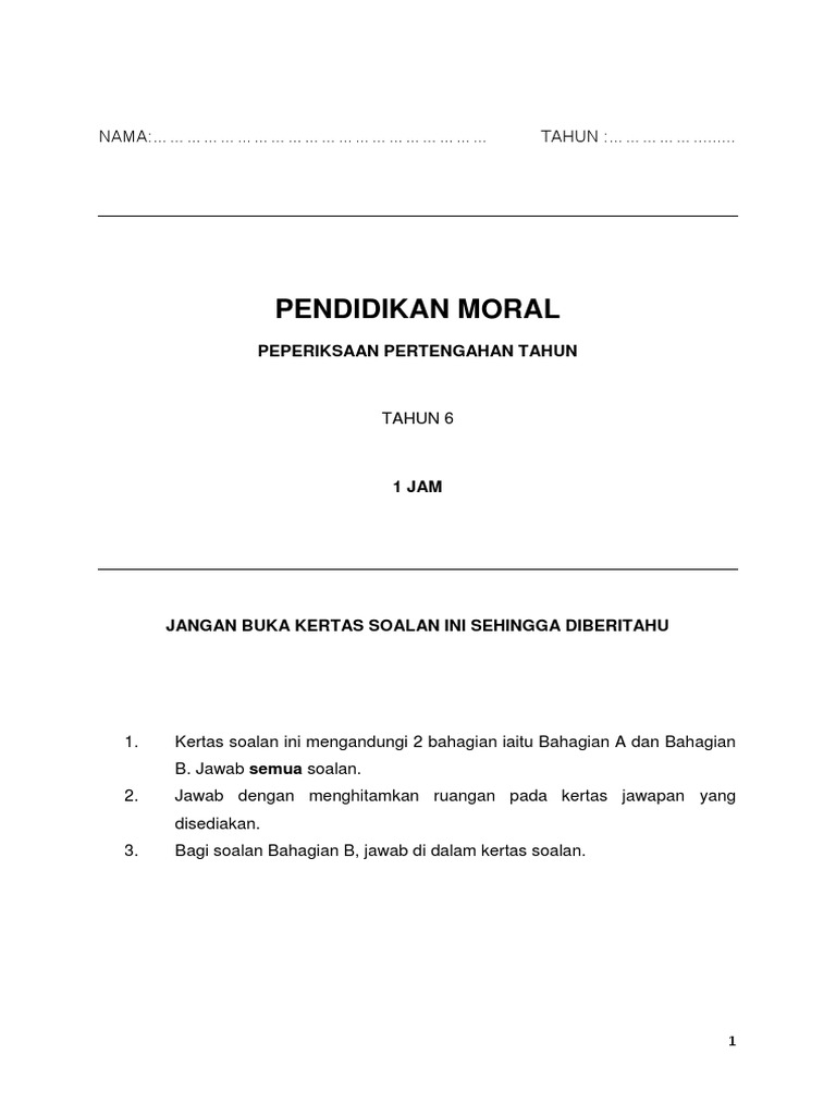 Pendidikan moral tahun 6 ( ujian bulan mac) 4 17. Jangan buka kertas soalan ini sehingga diberitahu 1. Jom download soalan peperiksaan awal tahun pendidikan via cikguayu.com. Home soalan peperiksaan peperiksaan awal tahun. Please fill this form, we will try to respond as soon as possible. 100%(16)100% found this document useful (16 votes). Kertas soalan pendidikan moral tahun 5 kssr via www.slideshare.net. Soalan percubaan pendidikan islam spm 2013 dan ramalan jawapan via homefamilysite.com. Peperiksaan sijil pelajaran malaysia (spm) adalah sangat penting buat para pelajar kerana ianya menentukan halatuju pendidikan tinggi dan seterusnya untuk mereka. Hormat negara rakyat sejahtera otros contenidos: Quizzes › society › morality › moral development. Menguji sejauh mana pengetahuan pendidikan moral dikalangan murid tahun 1. Senarai peperiksaan akhir tahun pendidikan moral tahun 5 yang bermanfaat khas untuk para guru perolehi pekeliling terbaru kerajaan.